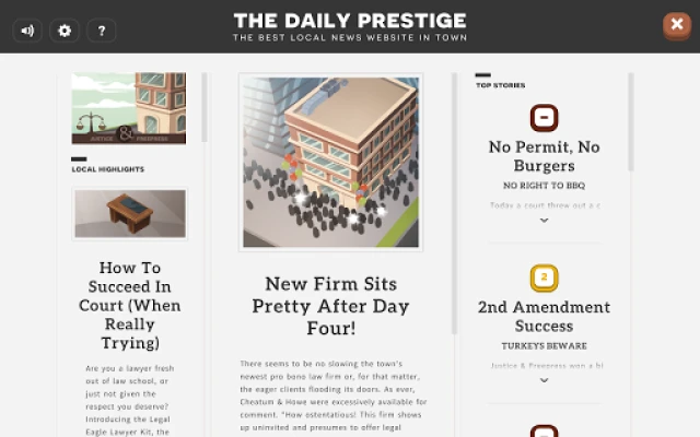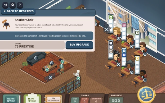 Spravujte svoju právnickú kanceláriu! Posudzujte potenciálnych klientov, priraďte im najlepších právnikov a vyhrajte súdne prípady. Čím viac klientov obslúžite a čím viac prípadov vyhráte, tým rýchlejšie vaša firma porastie a získa silnú pozíciu na trhu.