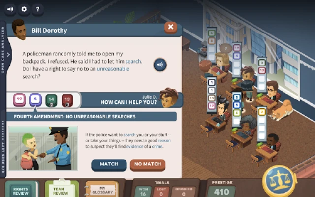 Ako budete úspešne viesť prípady a brániť ústavné slobody svojich klientov, vaša právnická kancelária bude prekvitať a získavať lukratívne výhody. Odomykajte si prístup k novým právnikom na riešenie čoraz zložitejších prípadov, vylepšite si čakáreň pre náročných klientov, alebo si doprajte kávovar pre extra energiu. S iCivics účtom môžete zbierať cenné Body vplyvu a odomykať rôzne herné úspechy, ktoré odrážajú vaše rastúce právnické majstrovstvo. Táto aplikácia nielen baví, ale aj vzdeláva, pomáhajúc vám prehĺbiť si poznatky o Zozname práv a ďalších kľúčových dodatkoch Ústavy, ako sú 13., 14., 15., 19. a 26. dodatok, a naučiť sa rozlišovať ústavné sťažnosti od bežných.