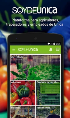 Aplikácia ponúka bohatú škálu služieb na zefektívnenie každého aspektu vašej činnosti. Sledujte svoju produkčnú aktivitu, kontrolujte týždenné predpovede kilogramov a pristupujte k podrobnému zoznamu dodacích listov. Monitorujte odobrané vzorky, analyzujte vyrovnania výnosov vrátane cien a majte prehľad o kilogramoch čakajúcich na likvidáciu. Dynamický kalendár zberu vám pomôže naplánovať úrodu produktov, zatiaľ čo technické recepty usmerňujú ošetrenia plodín. Prostredníctvom schránky Unica môžu partneri bez námahy odosielať dotazy a prijímať špecializovanú podporu. Okrem toho, všetci pracovníci Unica Group môžu jednoducho prezerať svoje odpracované hodiny a záznamy o príchodoch a odchodoch, zatiaľ čo špecializovaní zamestnanci môžu prostredníctvom schránky pre poľnohospodárov efektívne vybavovať všetky ich dotazy. soydeunica je komplexným digitálnym centrom pre všetkých partnerov a zamestnancov Unica Group.